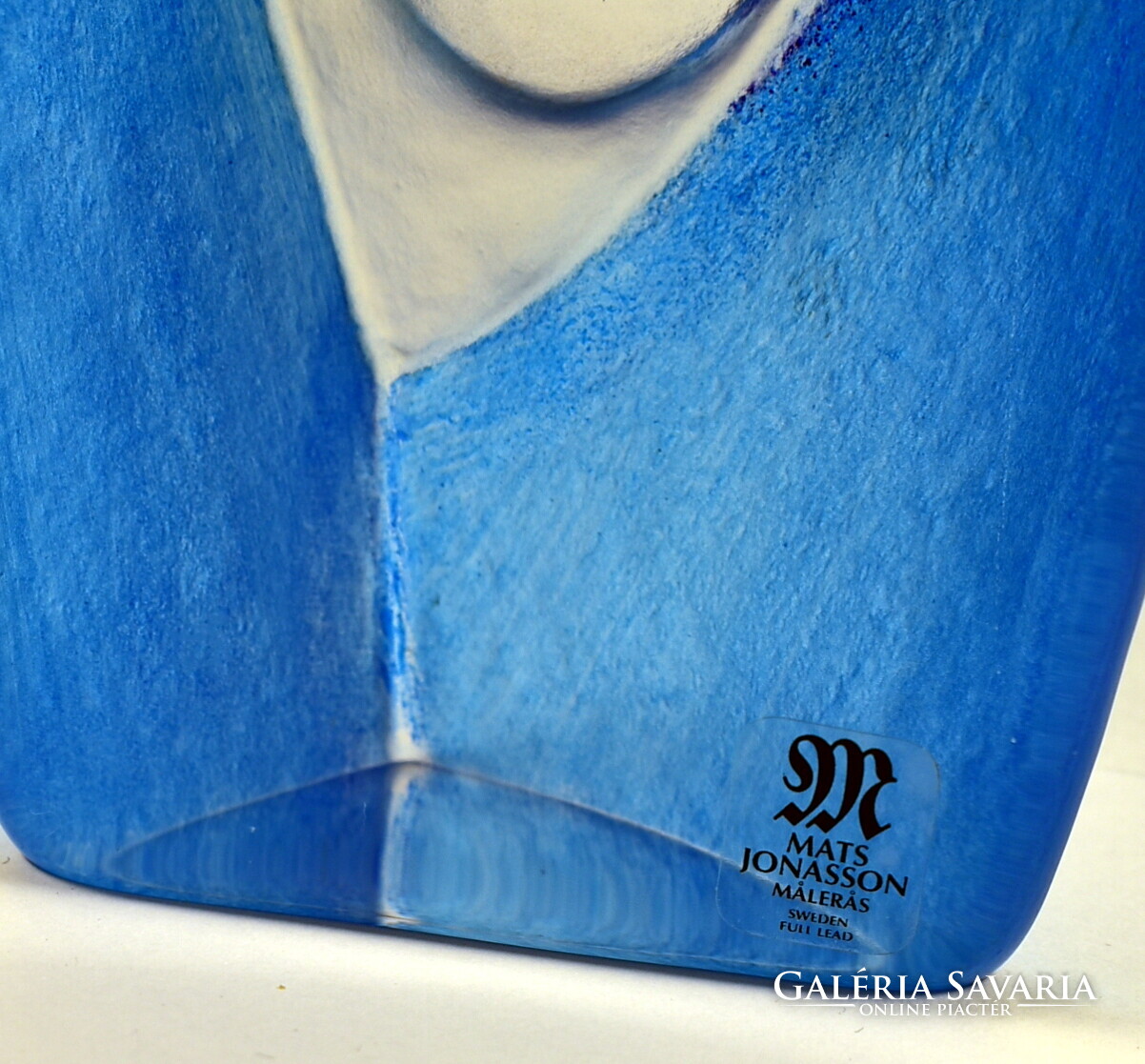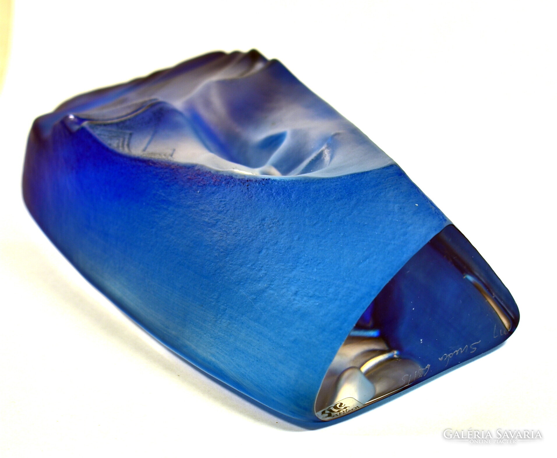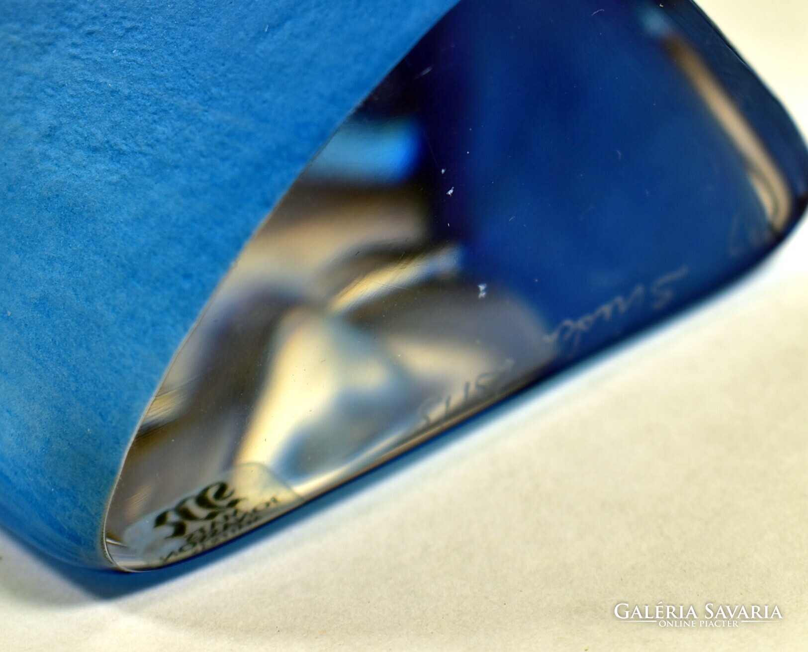 Anyagában színezett formázott kristályüveg , jelezett , csiszolt aljában gravírozással , ritka modell a nemzetközileg elismert Svéd üvegművestől ! Hibátlan , m.: 18.5 x 8 cm Súly 1 kiló !
