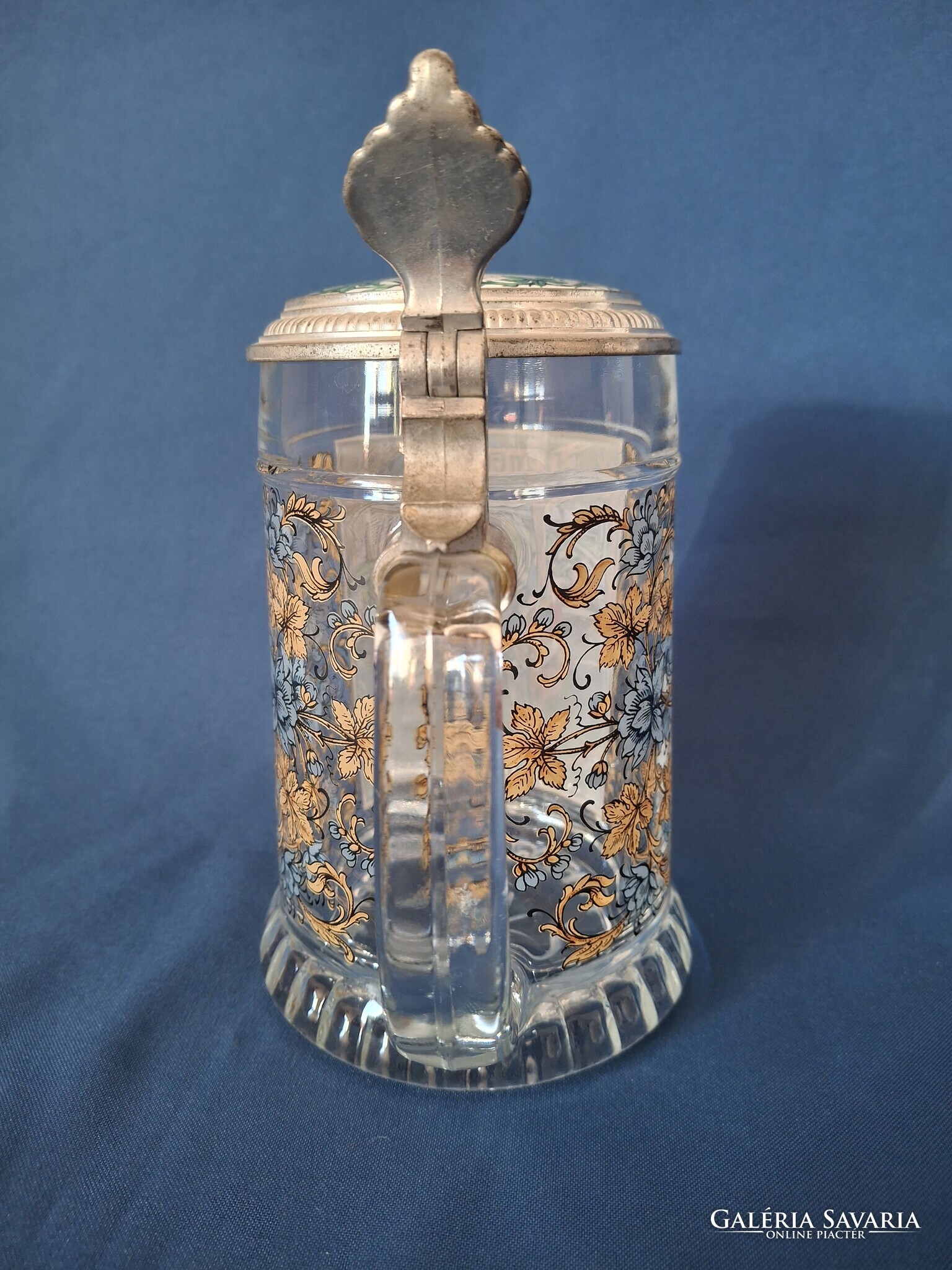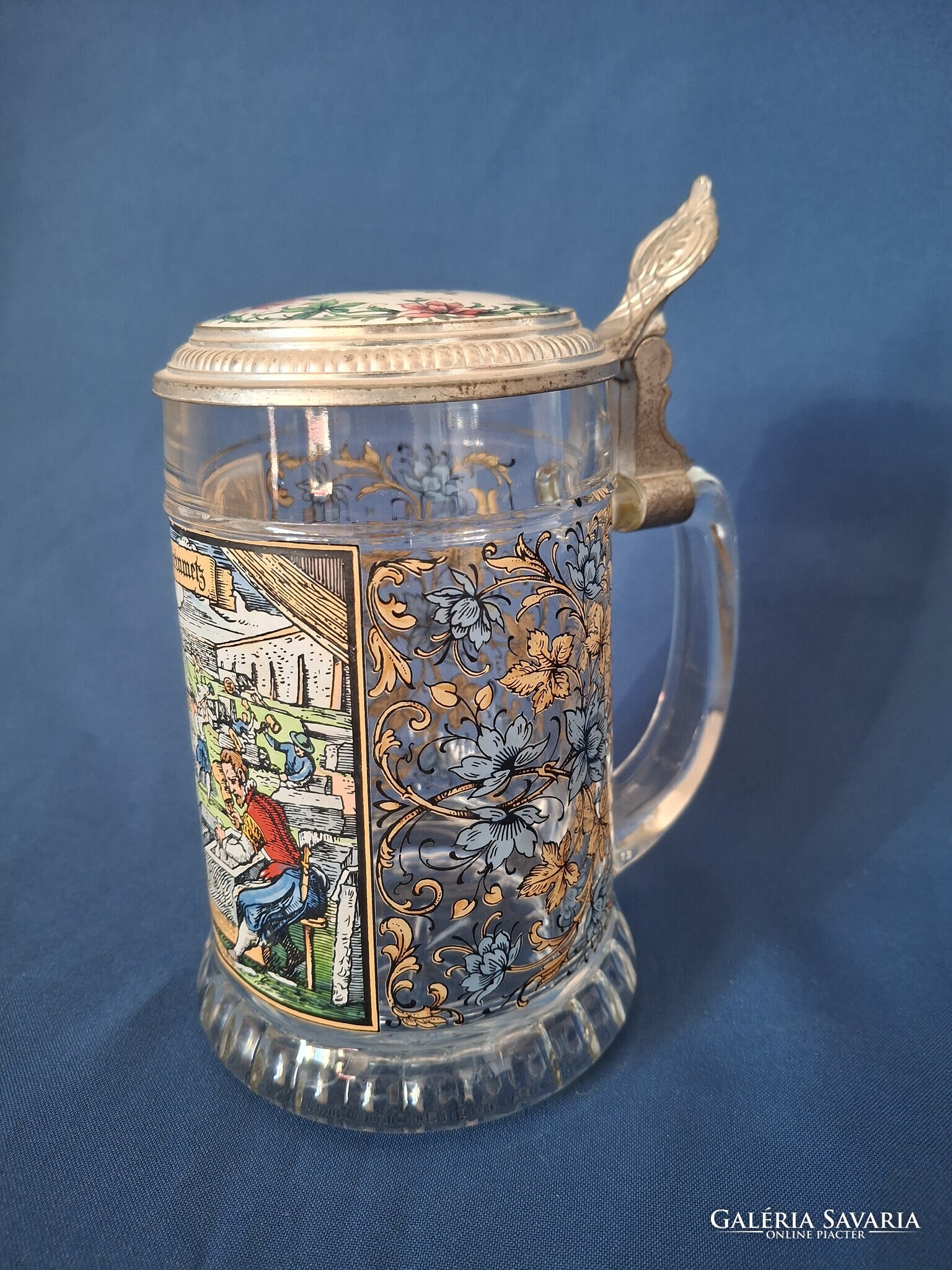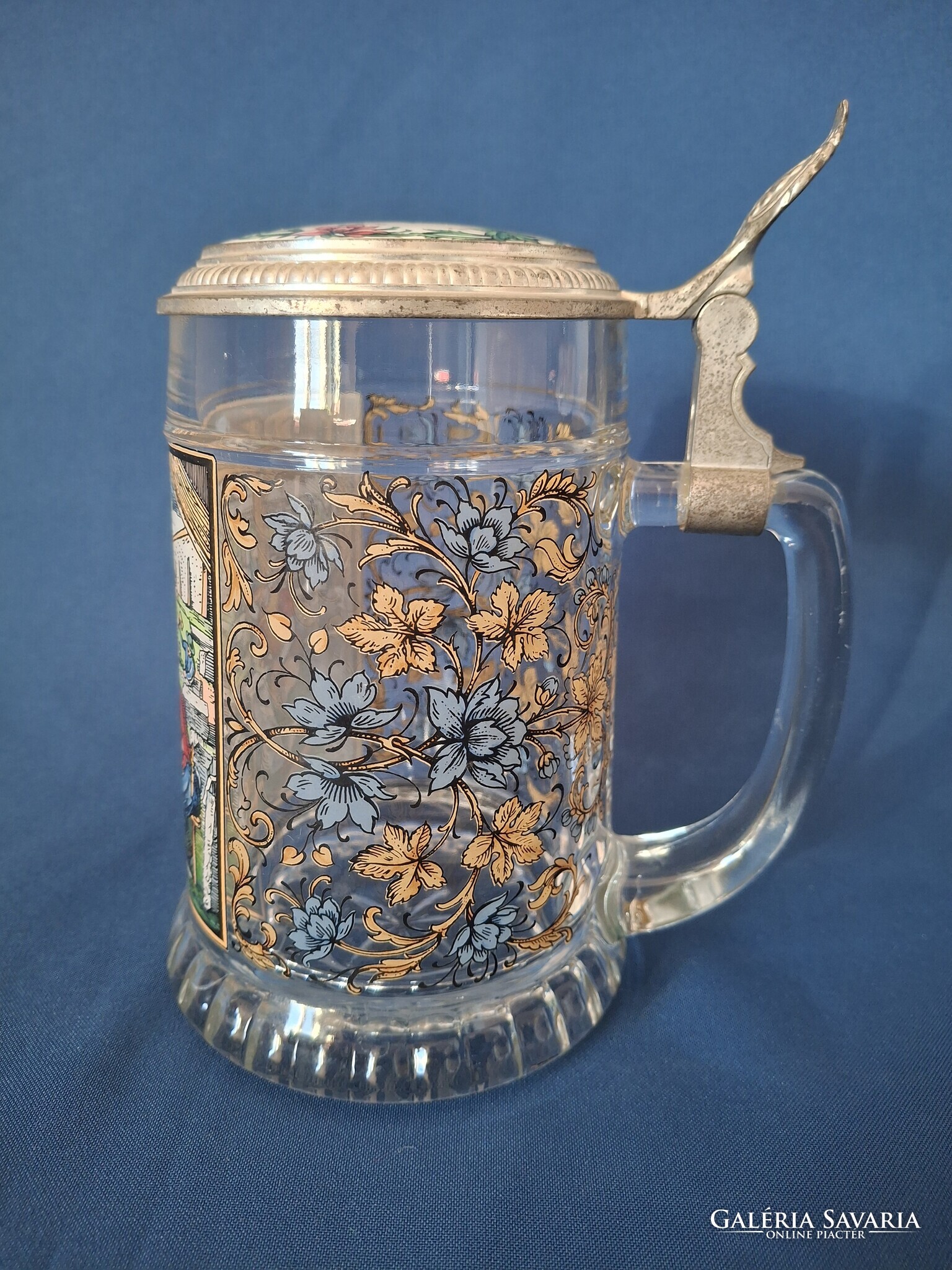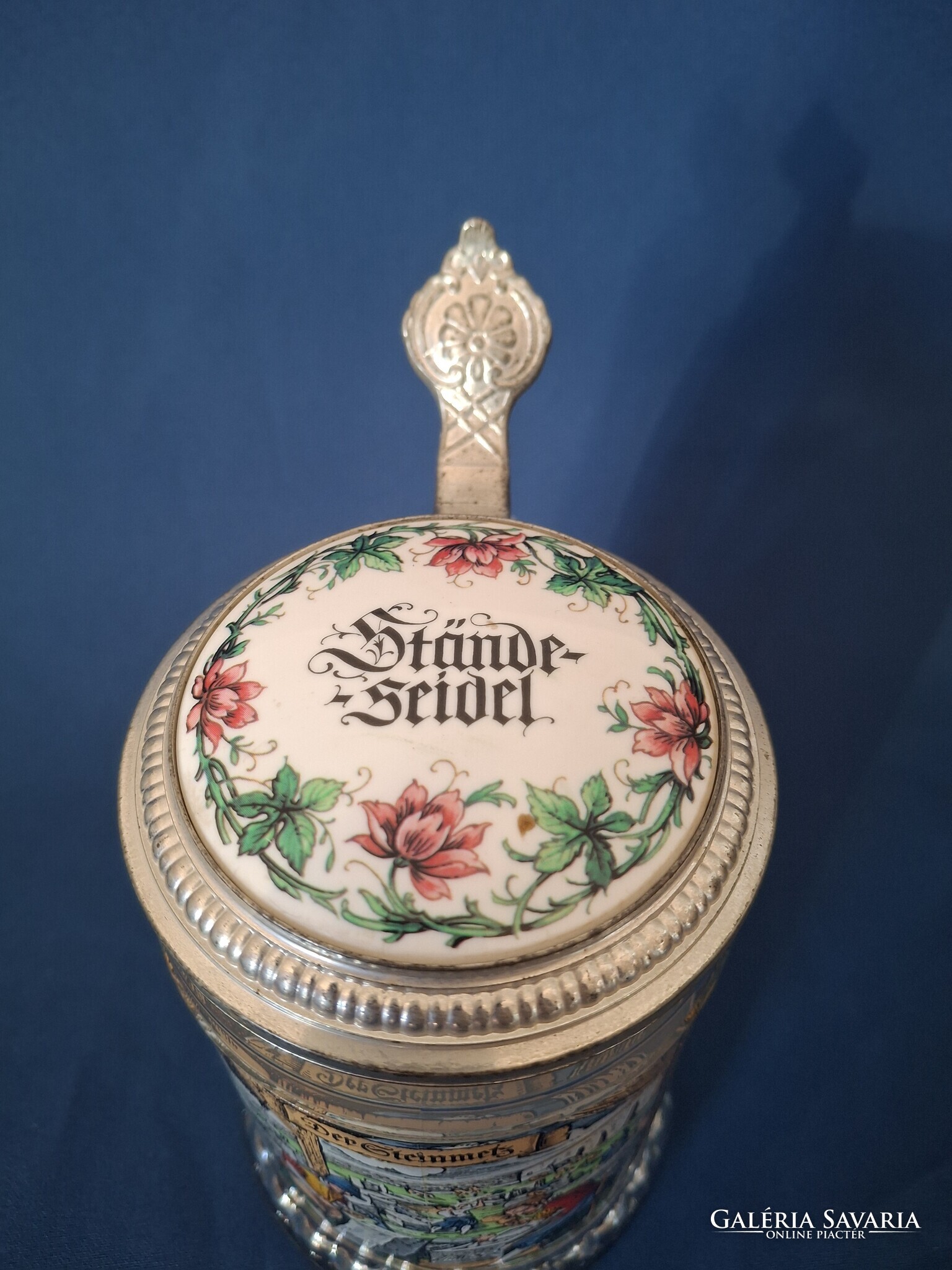 Eladó egy nagyon szép állapotban lévő, német, ónfedeles söröskorsó. A fedél belsejében a gyártó cég monogramja. Űrtartalma kb fél liter .