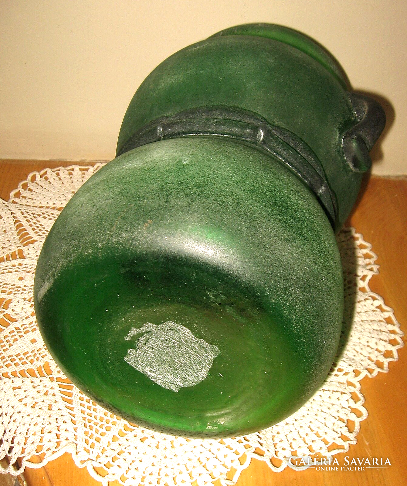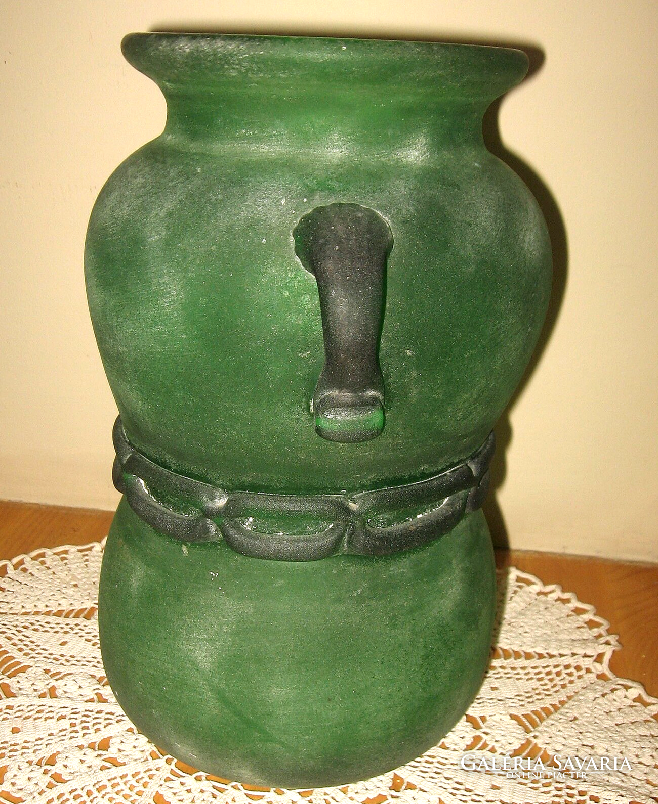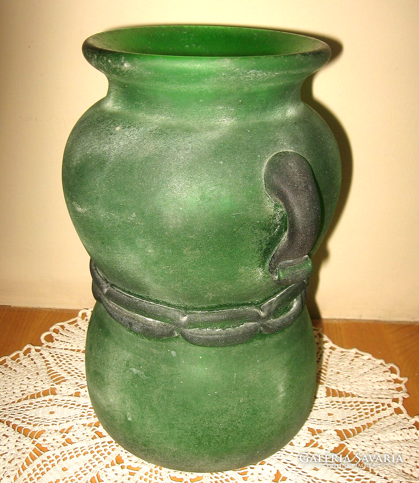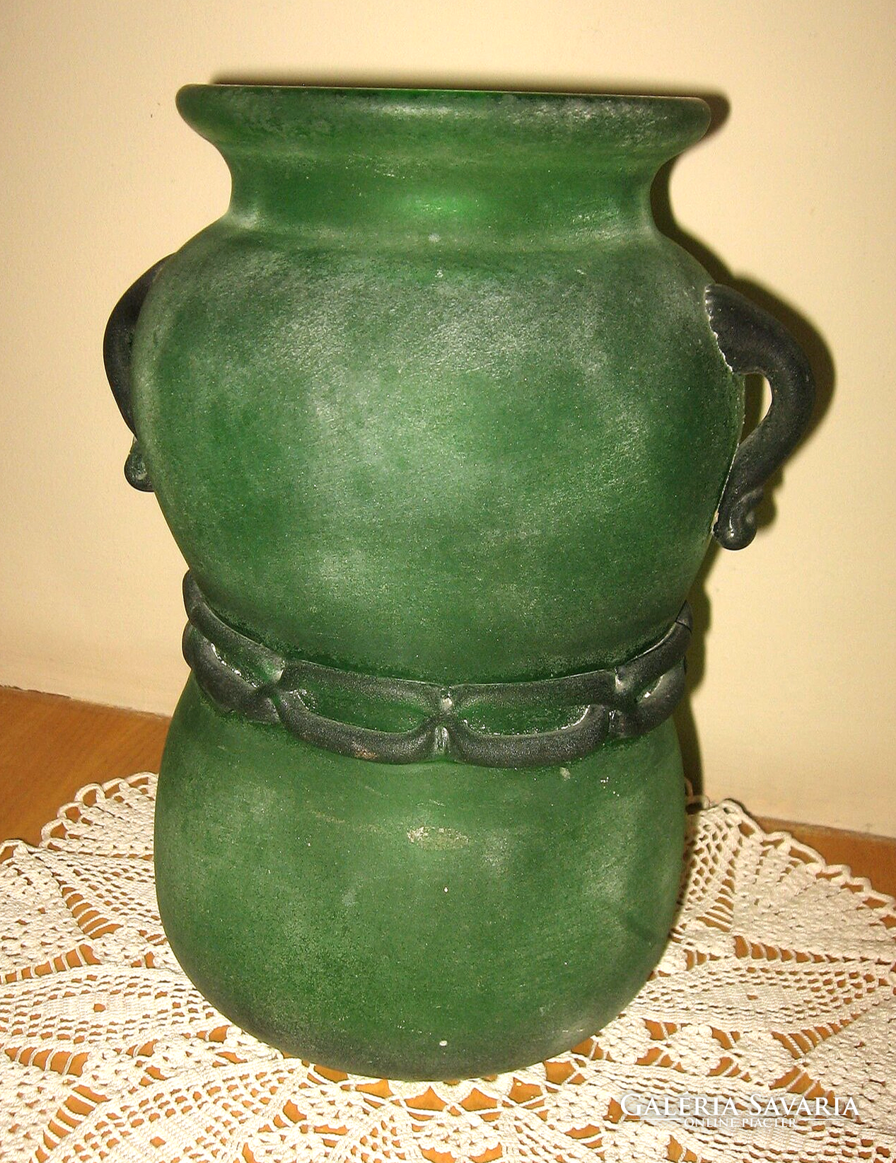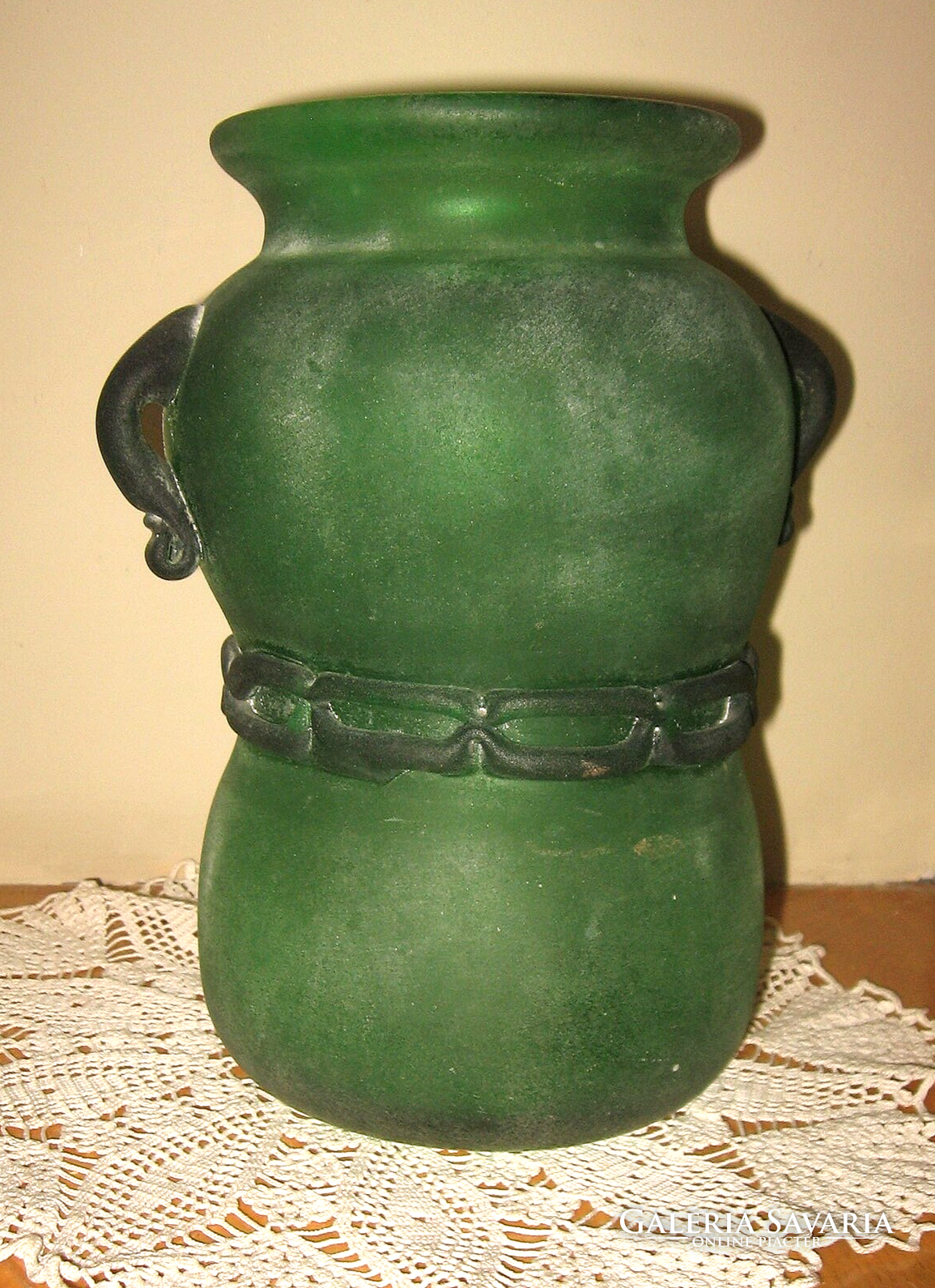 Nagyon szép állapotú kézzel fújt és formázott Scavo technikával készített üveg váza. Oldalán láncszerű üvegrátéttel és két fogófüllel díszített. XX.század második fele.