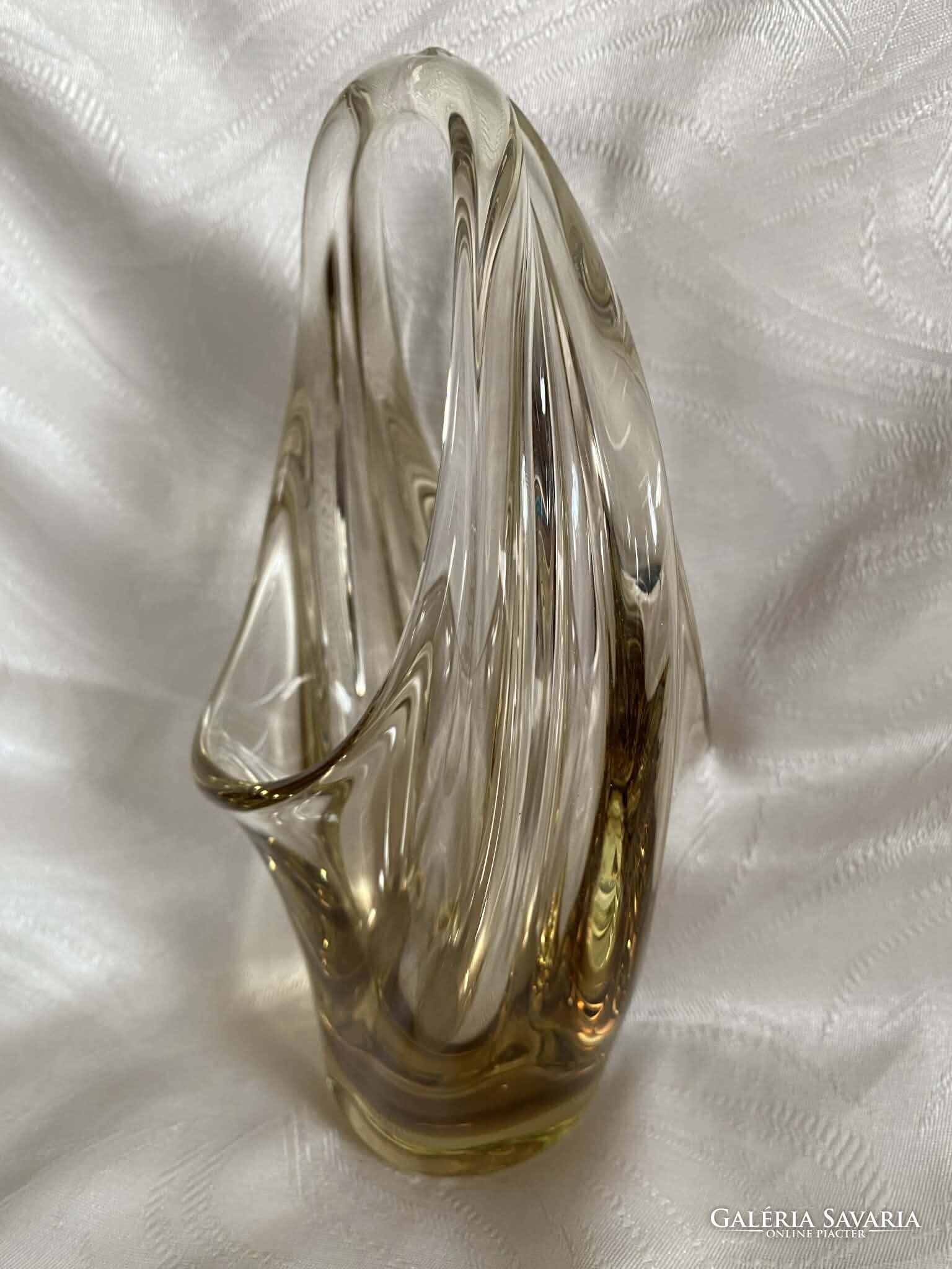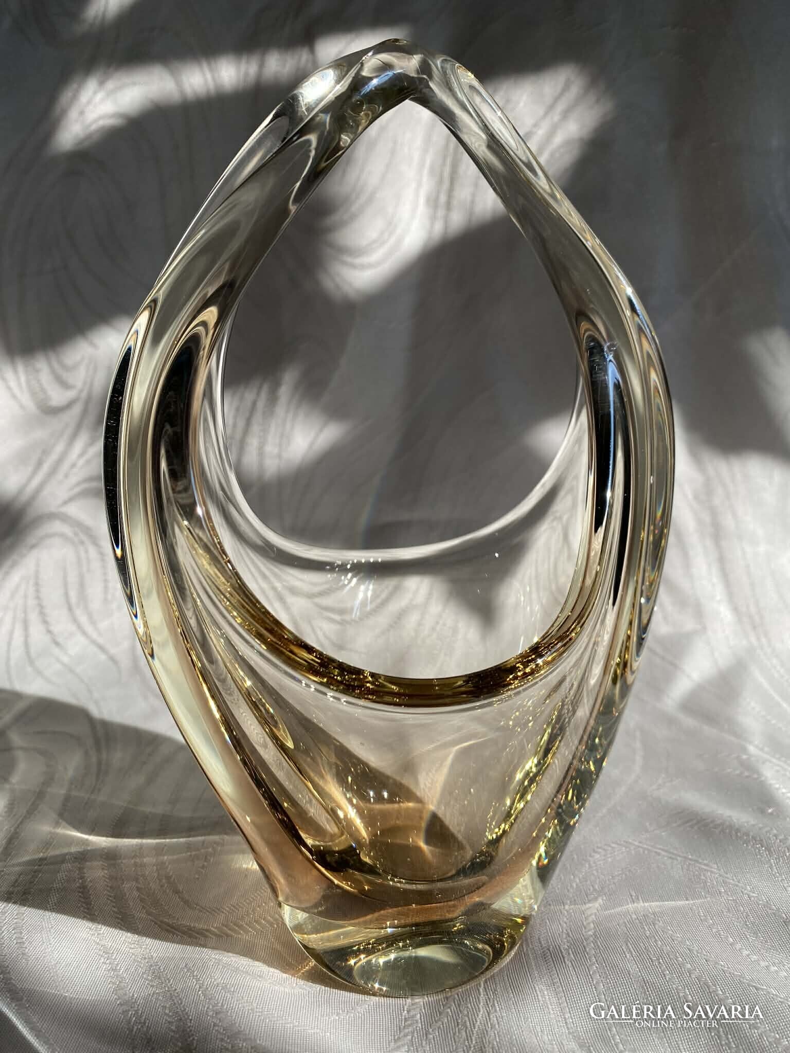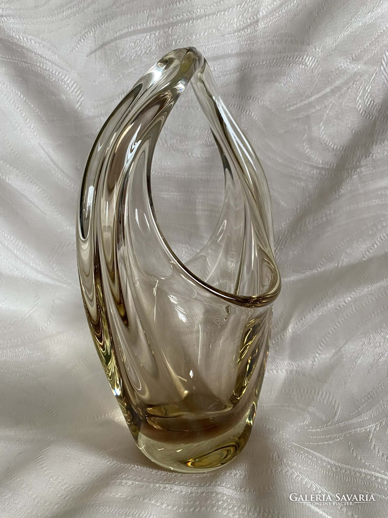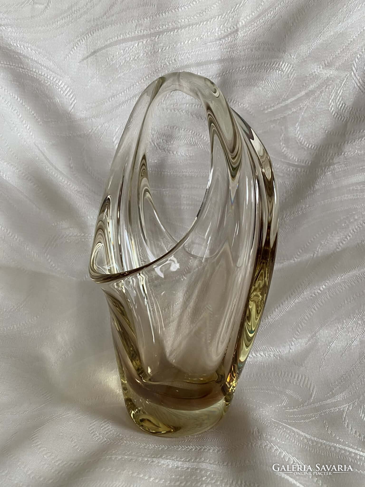 A kosár alapvetően kristálytiszta, színtelen üvegből készült, ám finom citromsárga árnyalatok futnak át rajta.