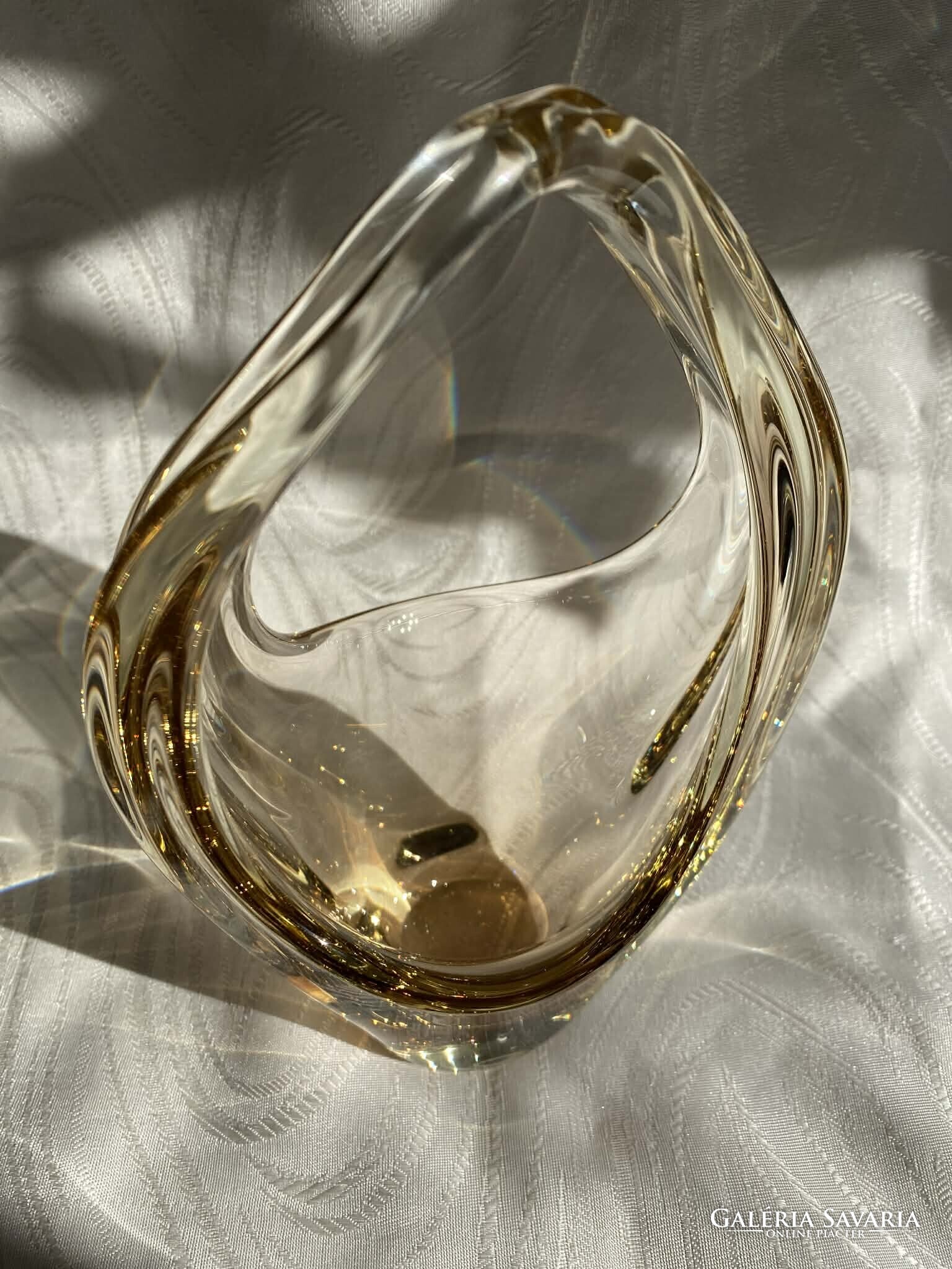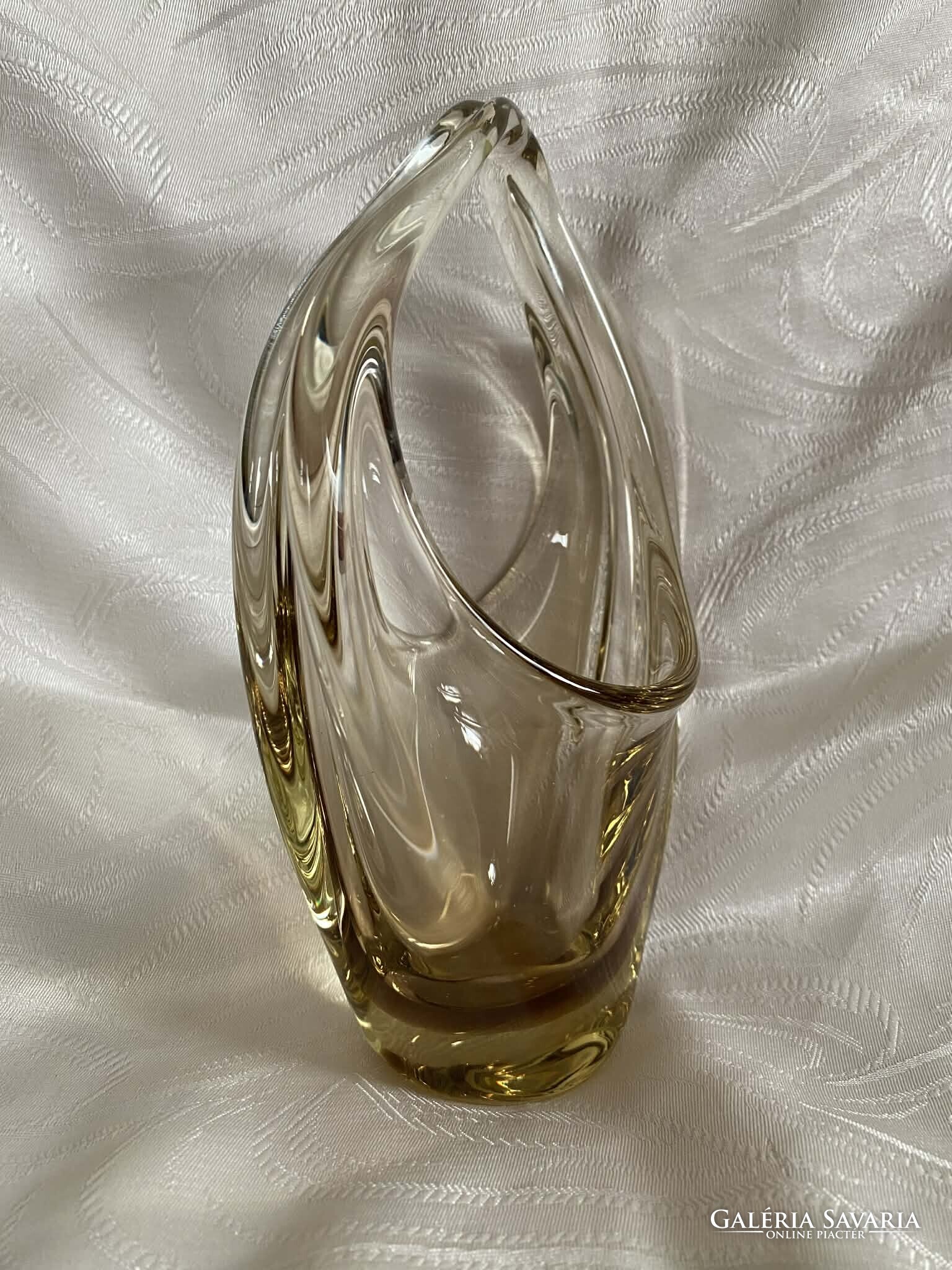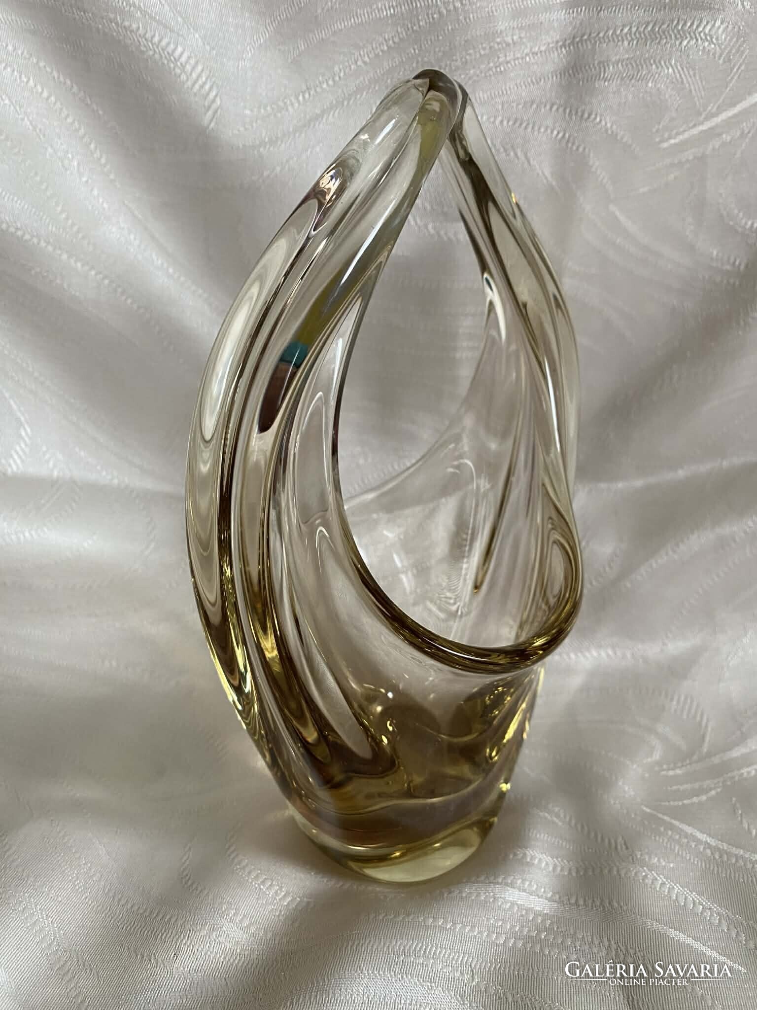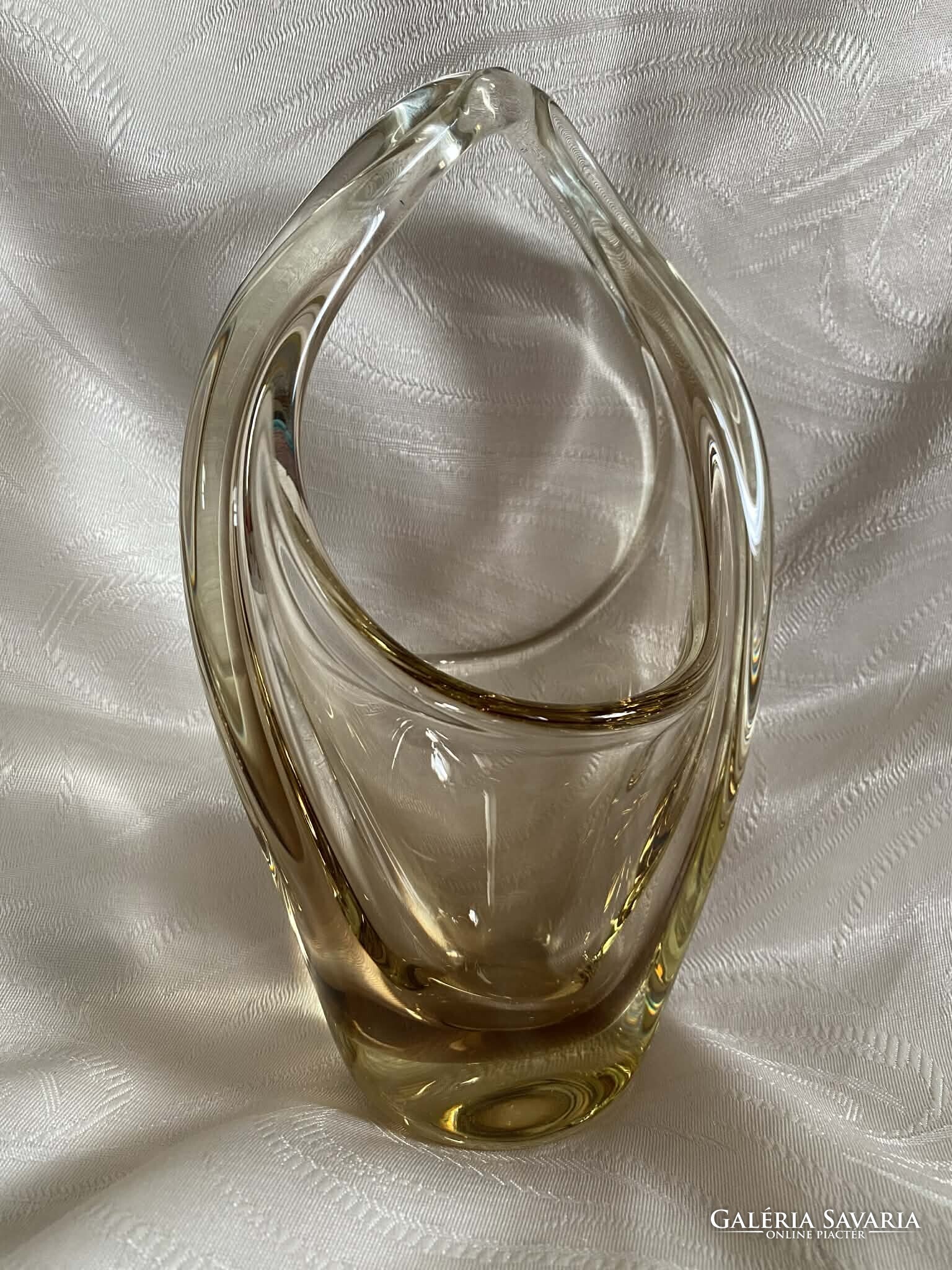 A kosár alapvetően kristálytiszta, színtelen üvegből készült, ám finom citromsárga árnyalatok futnak át rajta.