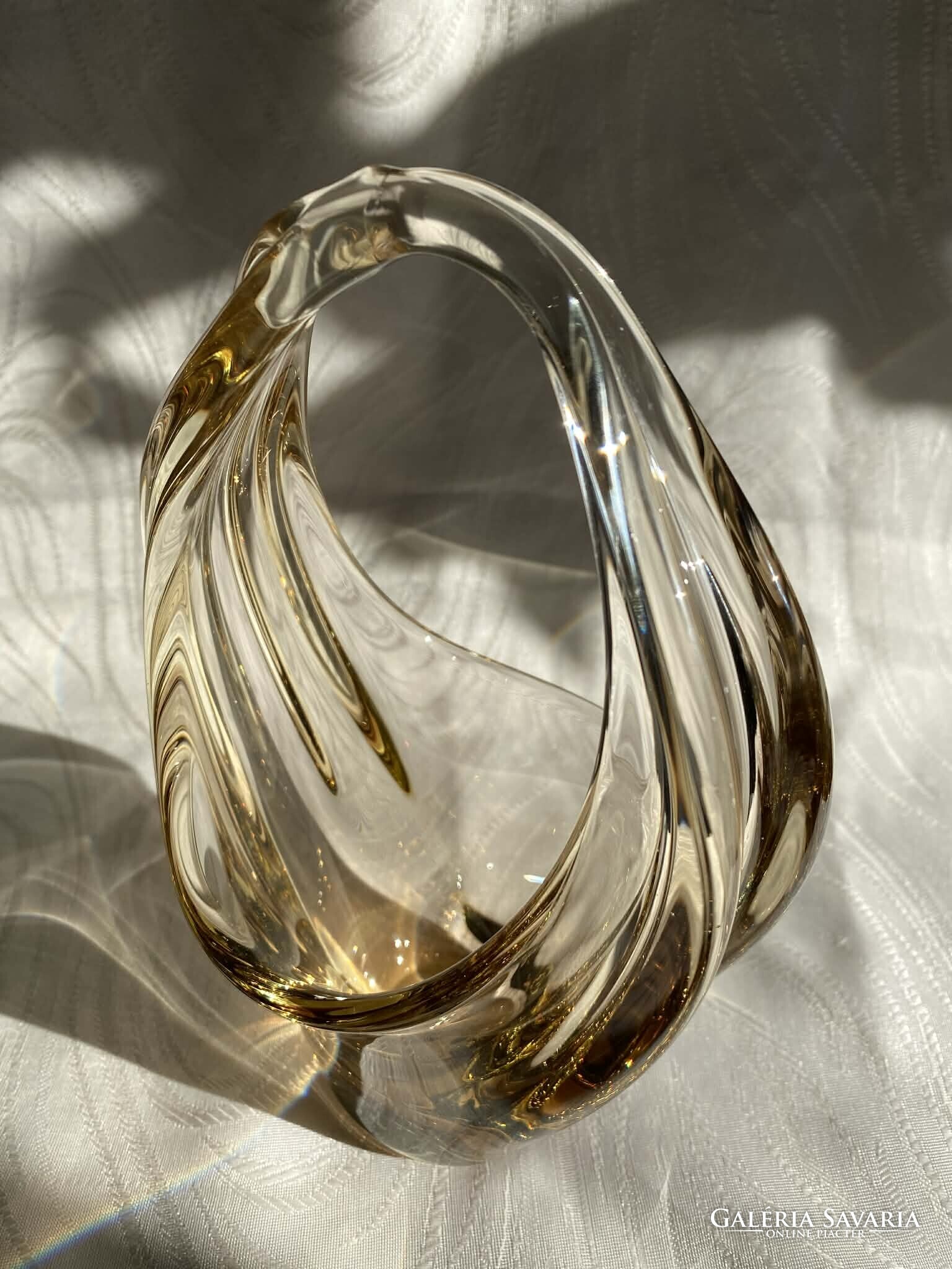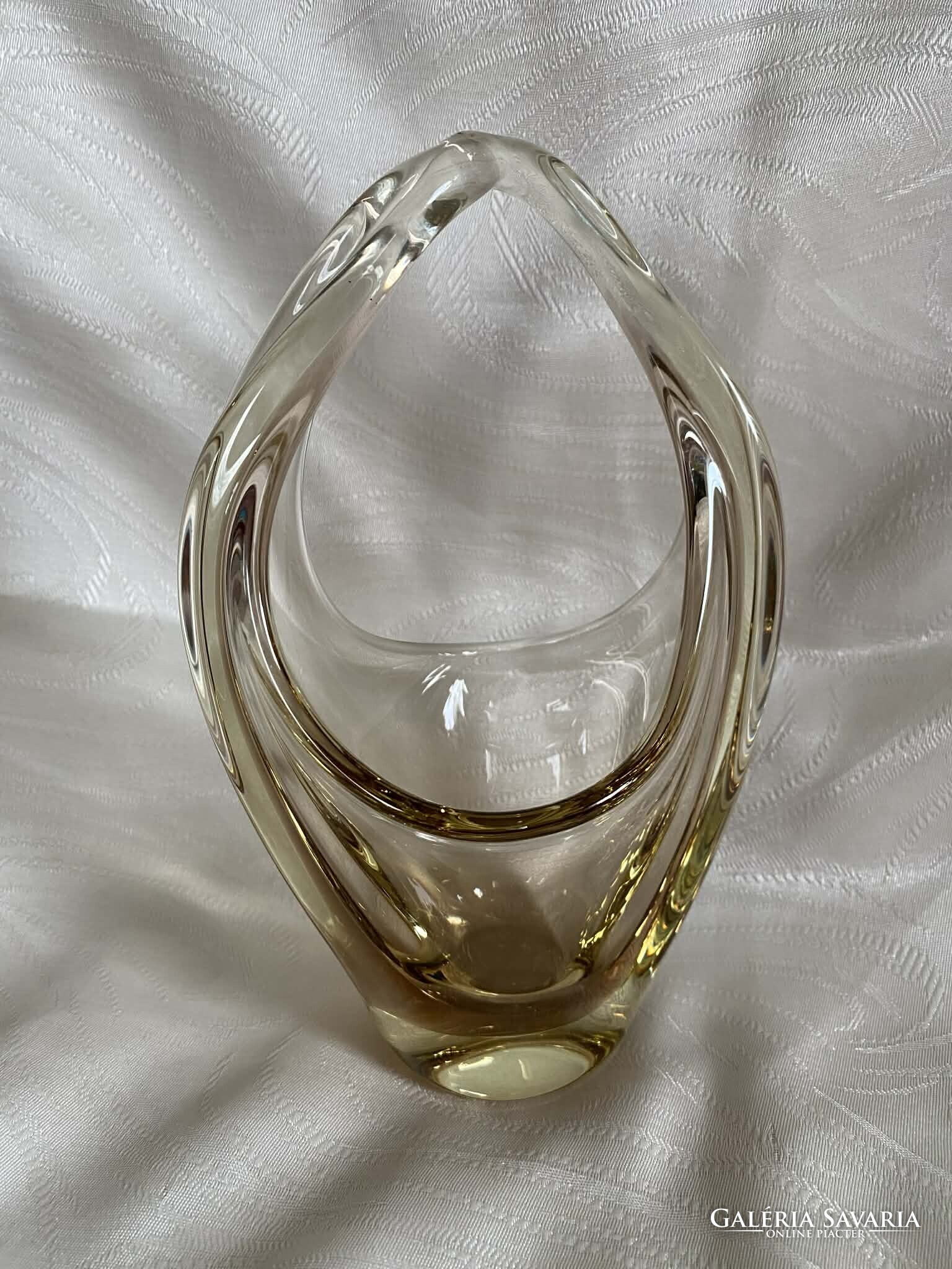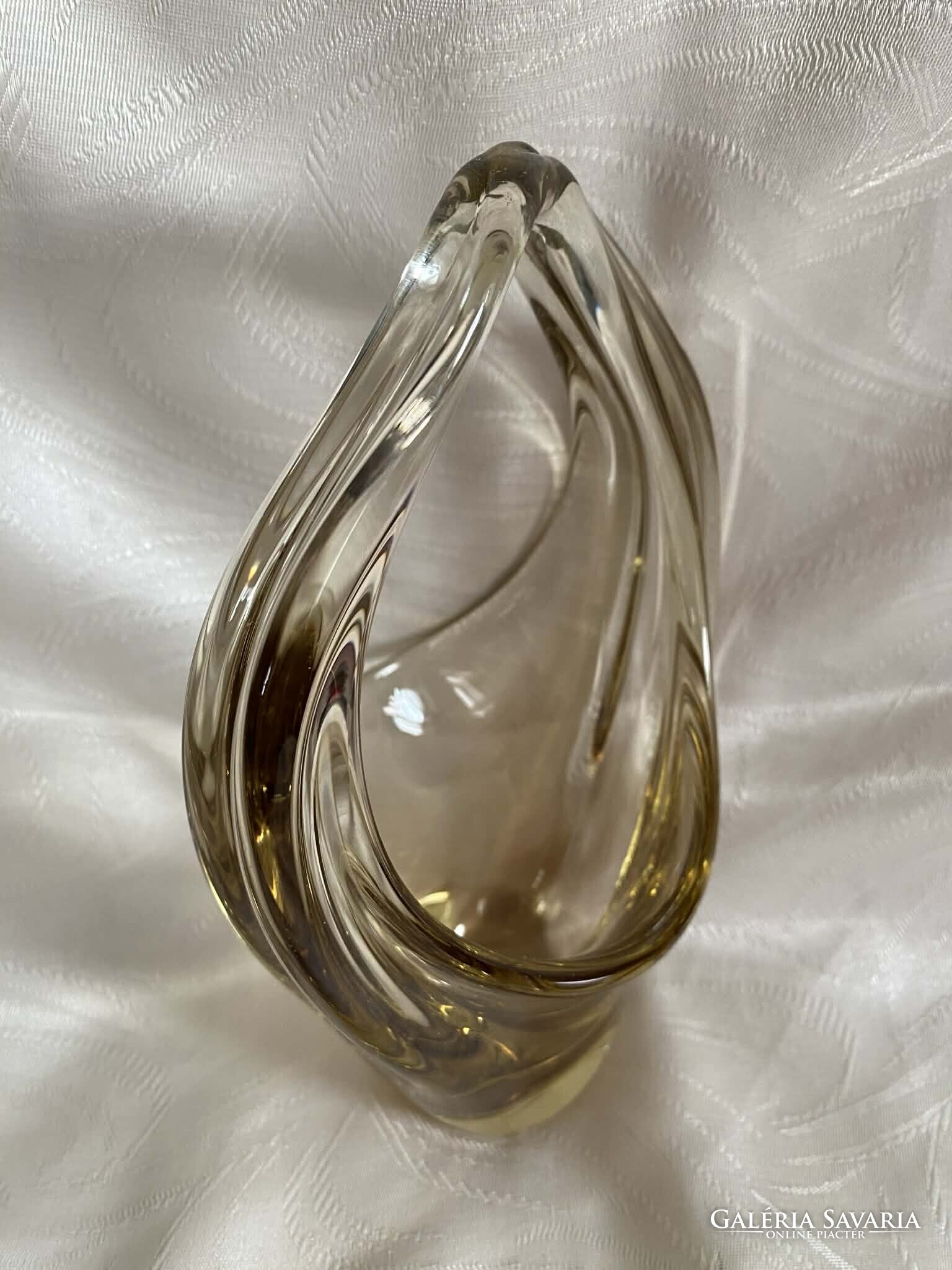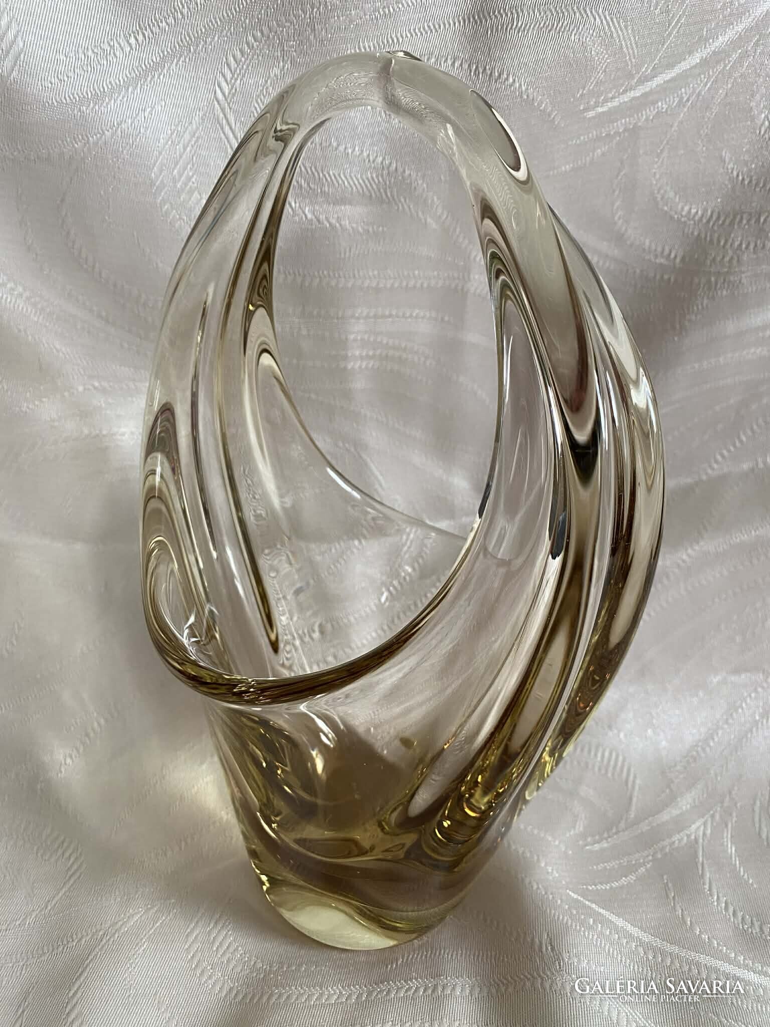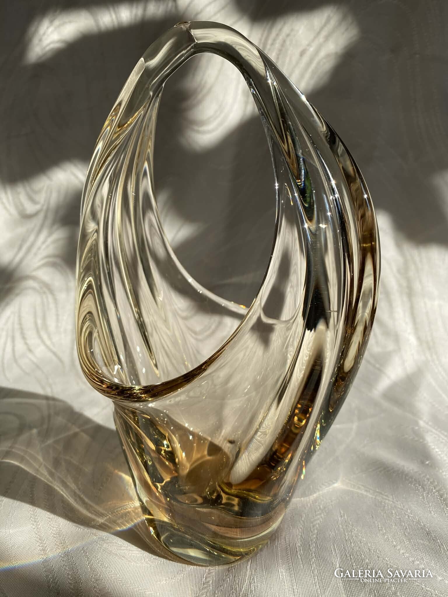 A kosár alapvetően kristálytiszta, színtelen üvegből készült, ám finom citromsárga árnyalatok futnak át rajta.