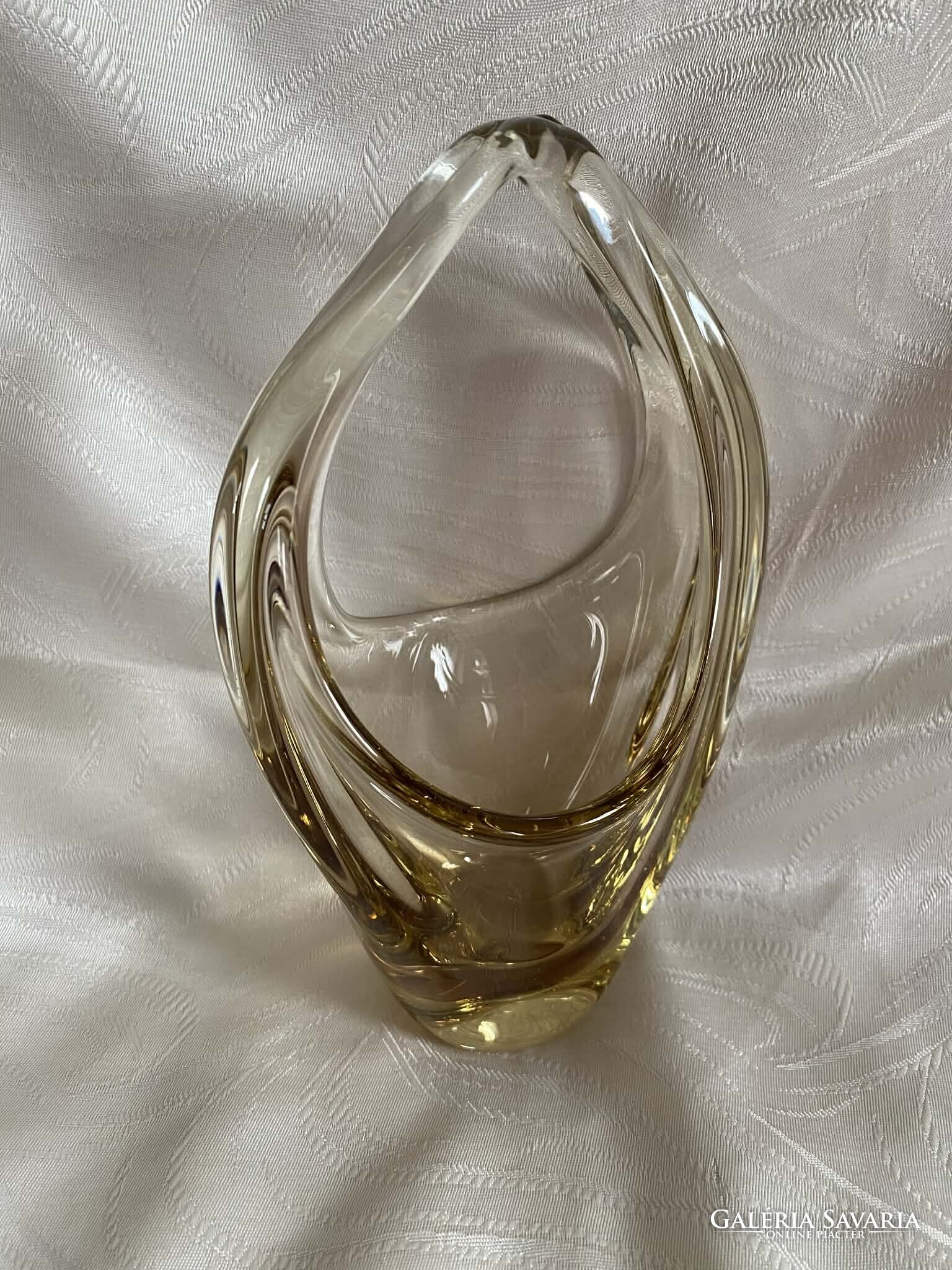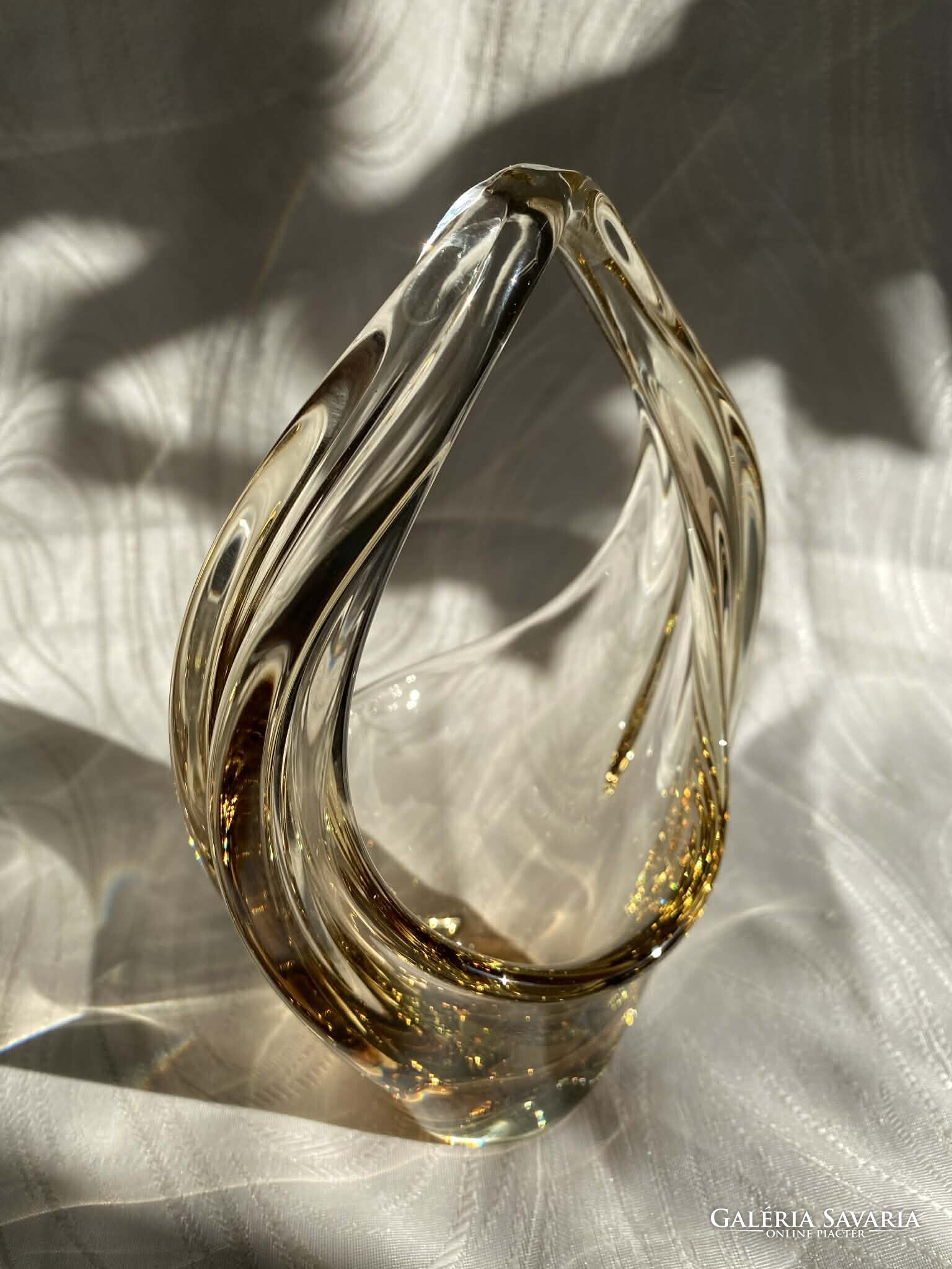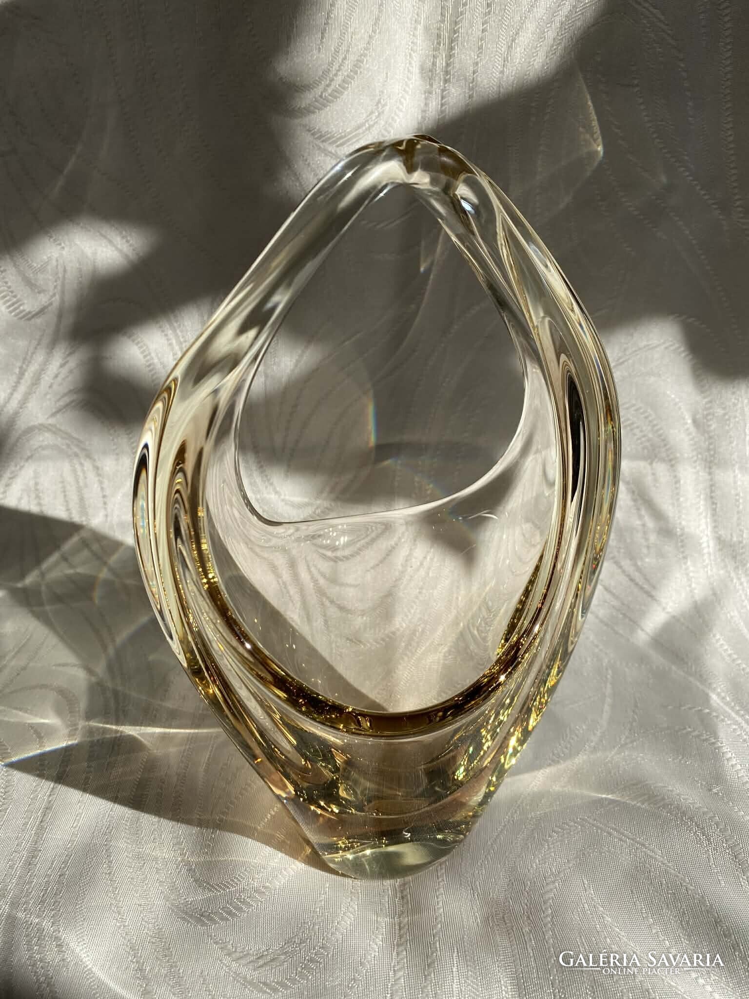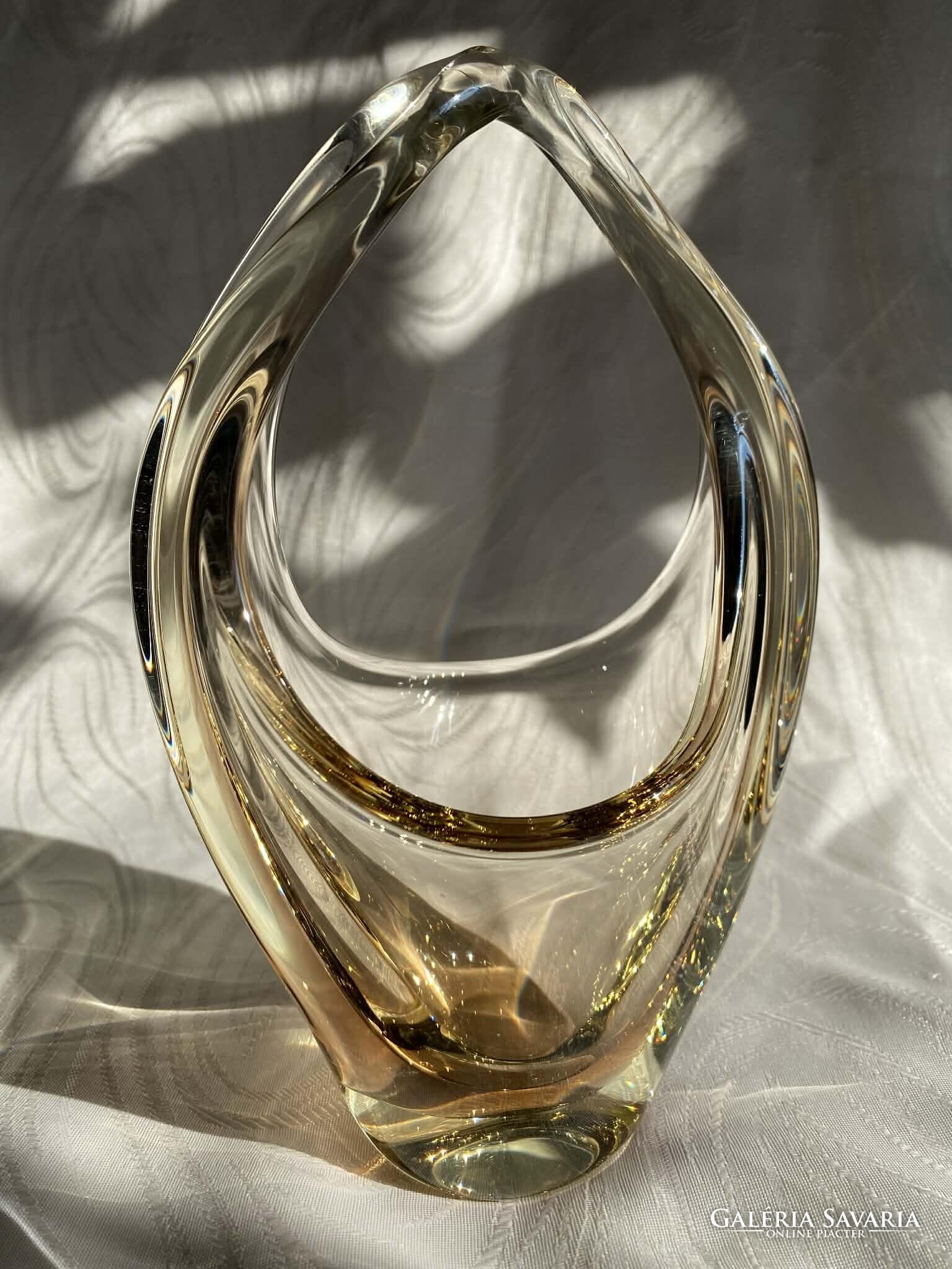 A kosár alapvetően kristálytiszta, színtelen üvegből készült, ám finom citromsárga árnyalatok futnak át rajta.