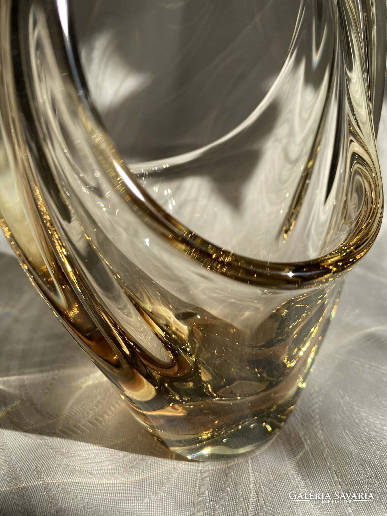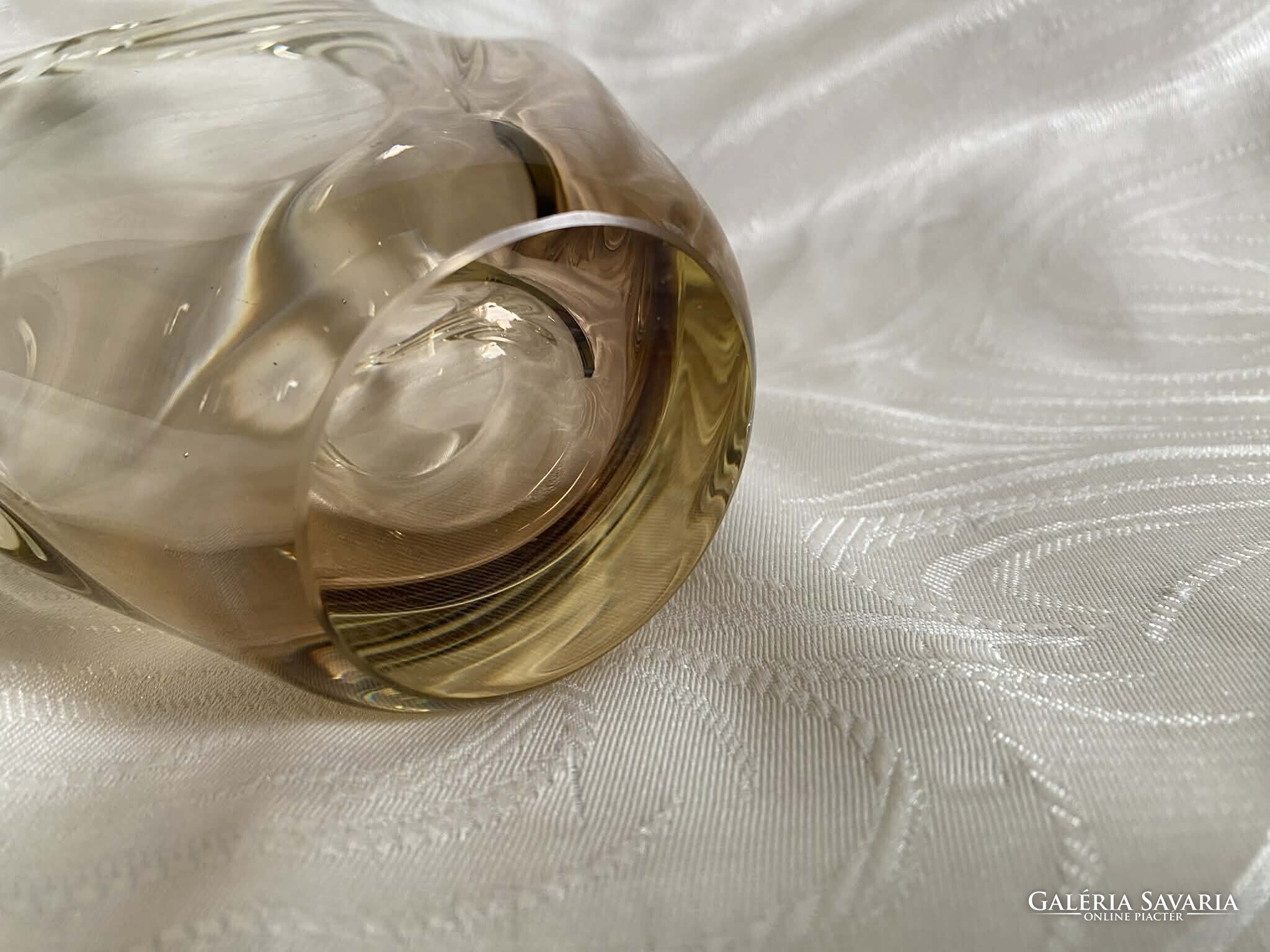 A tárgy különleges optikai tulajdonságokkal bír: míg szórt fényben egy lágy, áttetsző citrin árnyalat jellemzi, közvetlen megvilágításban elképesztő módon töri a fényt, és a mélyebb tónusoktól a ragyogó aranyig minden árnyalat megjelenik benne. (lásd. képek!)