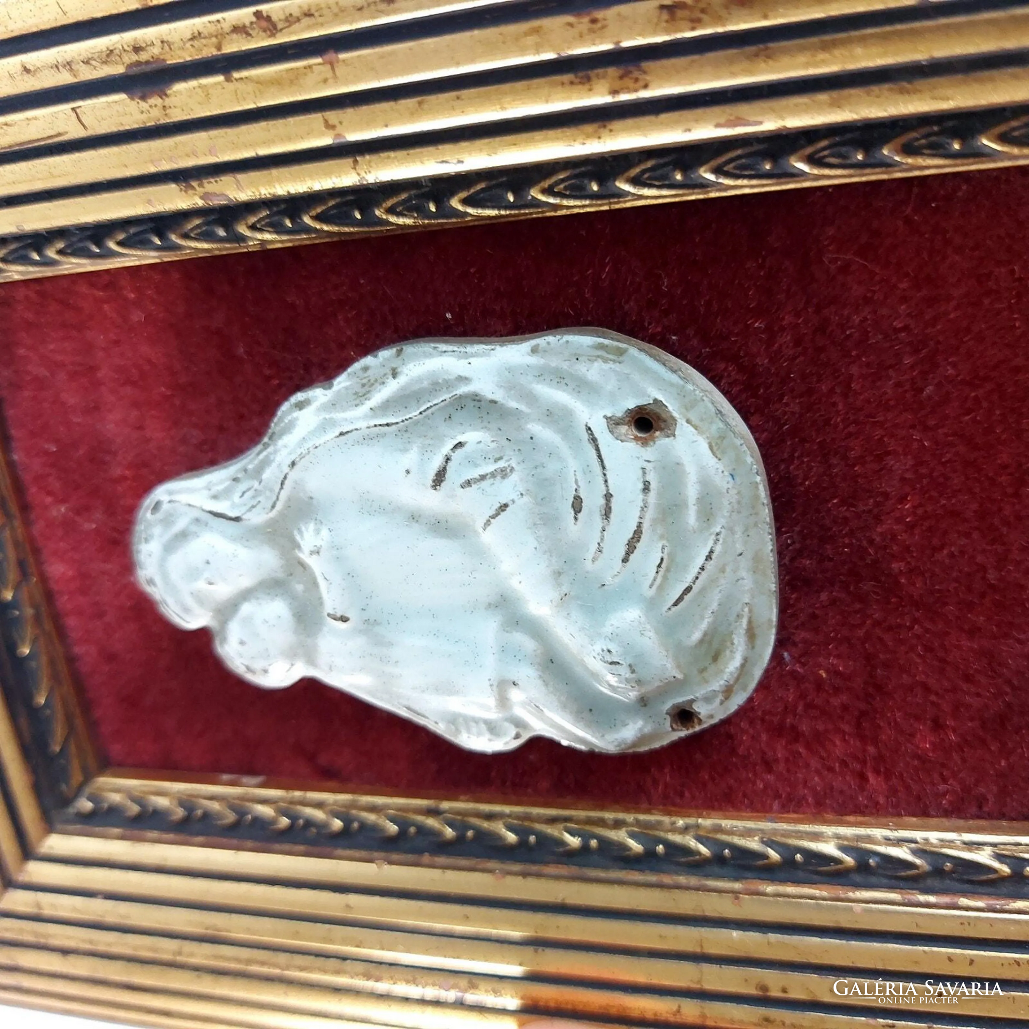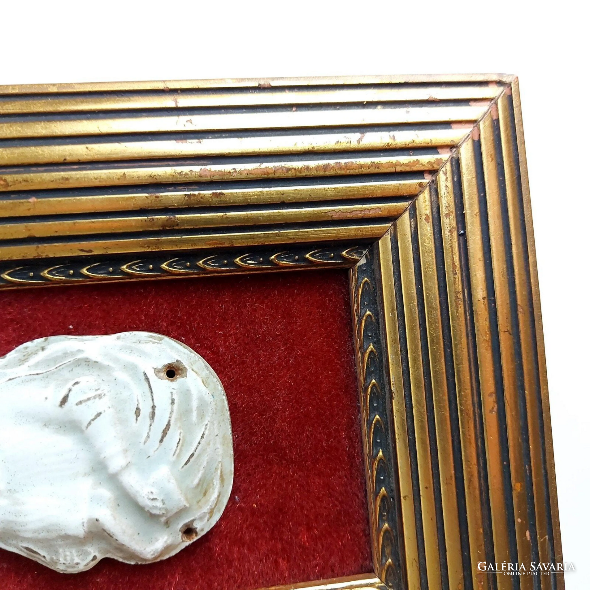A dombormű vörös bársonyra van szerelve, és arany színű faragott fa neoklasszikus/viktoriánus keretben.