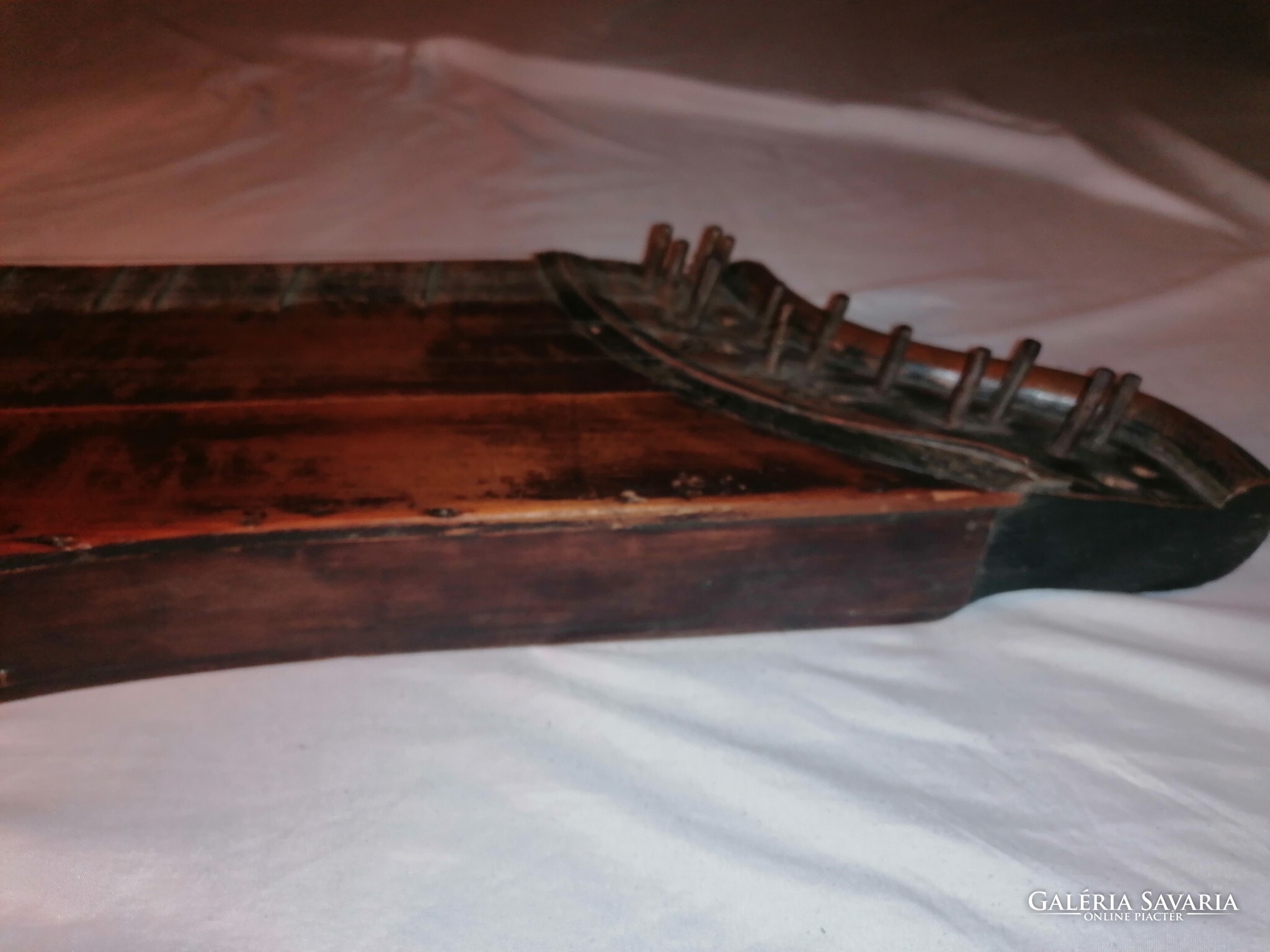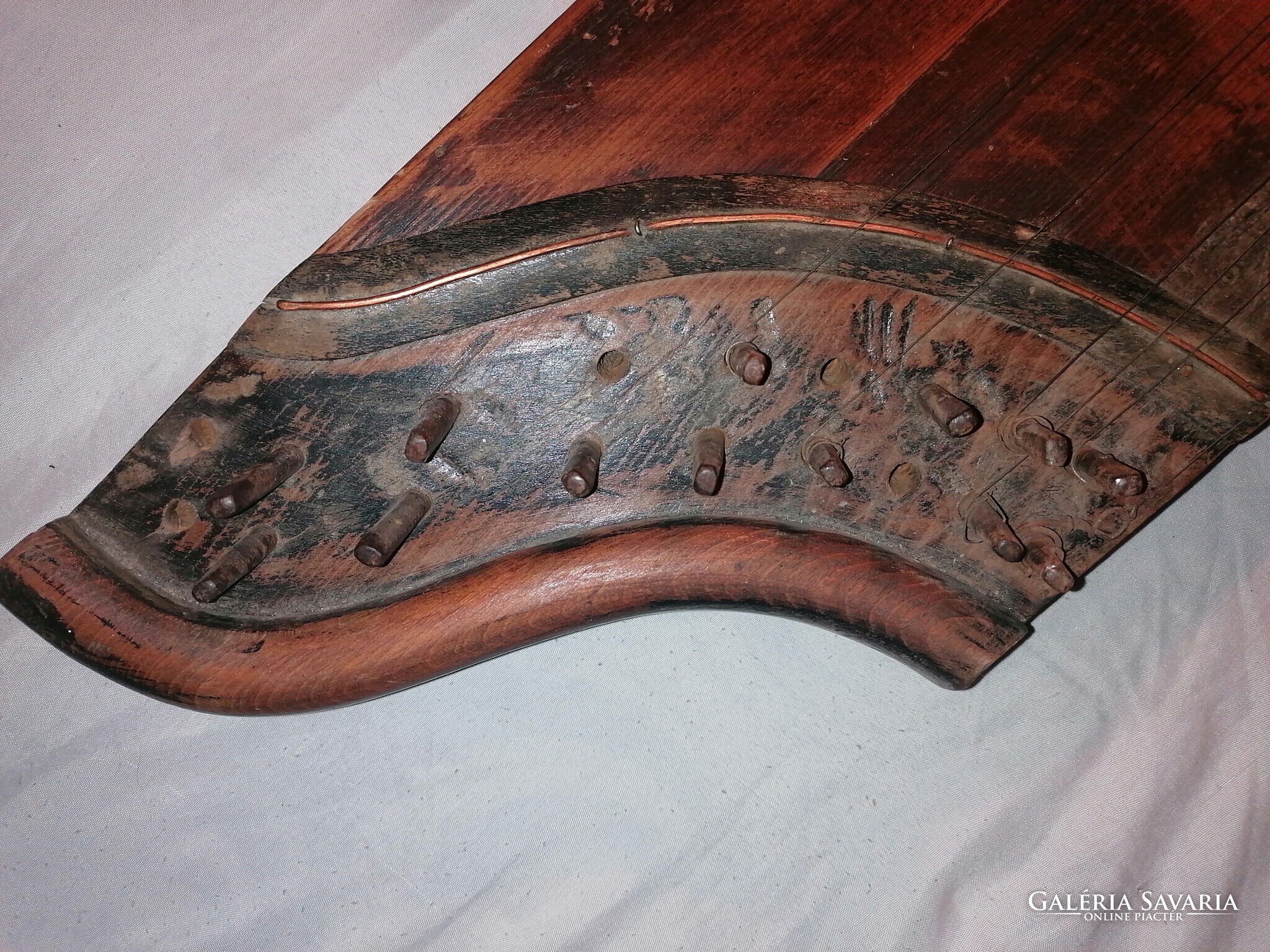 Nagy méretű citera, fenyőfából, zárt doboz felépítésű, három kis lábon áll. A fa részek jó állapotban vannak, a ragasztások nem váltak el, viszont a húrfeszítő kulcsok közül 5 db hiányzik. Teljes húrozásra szorul.